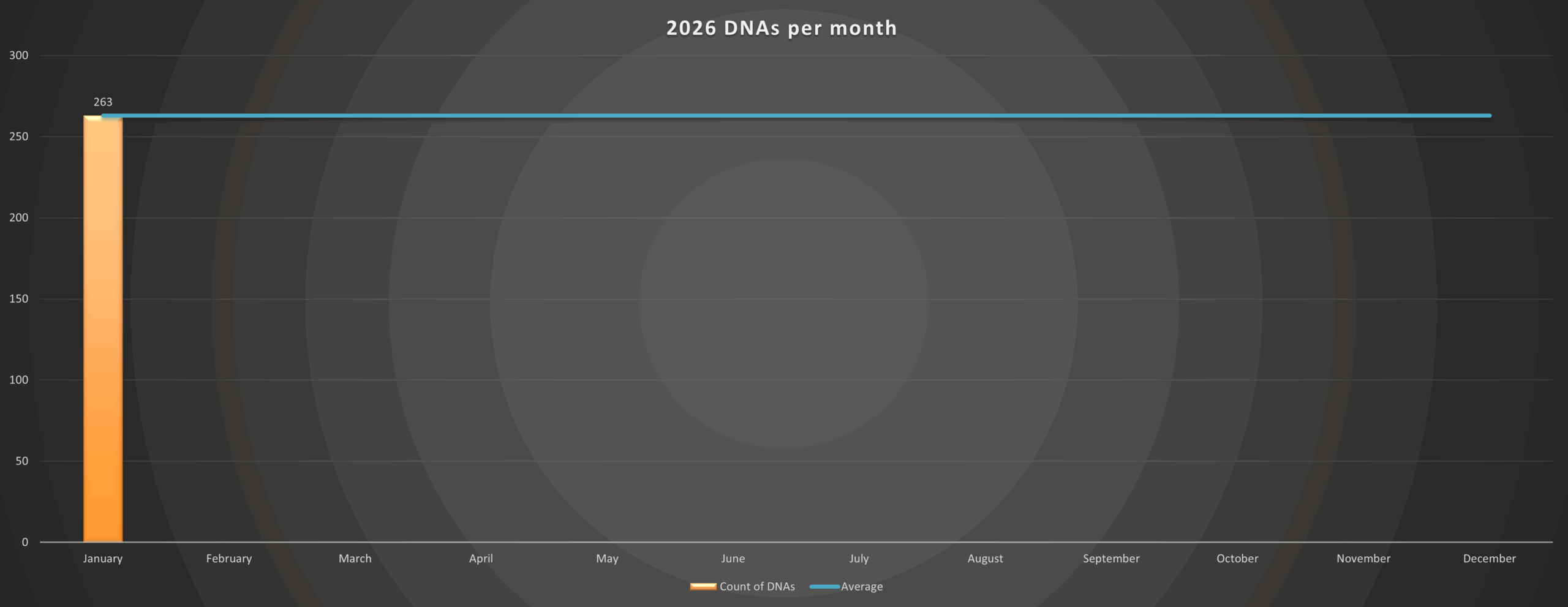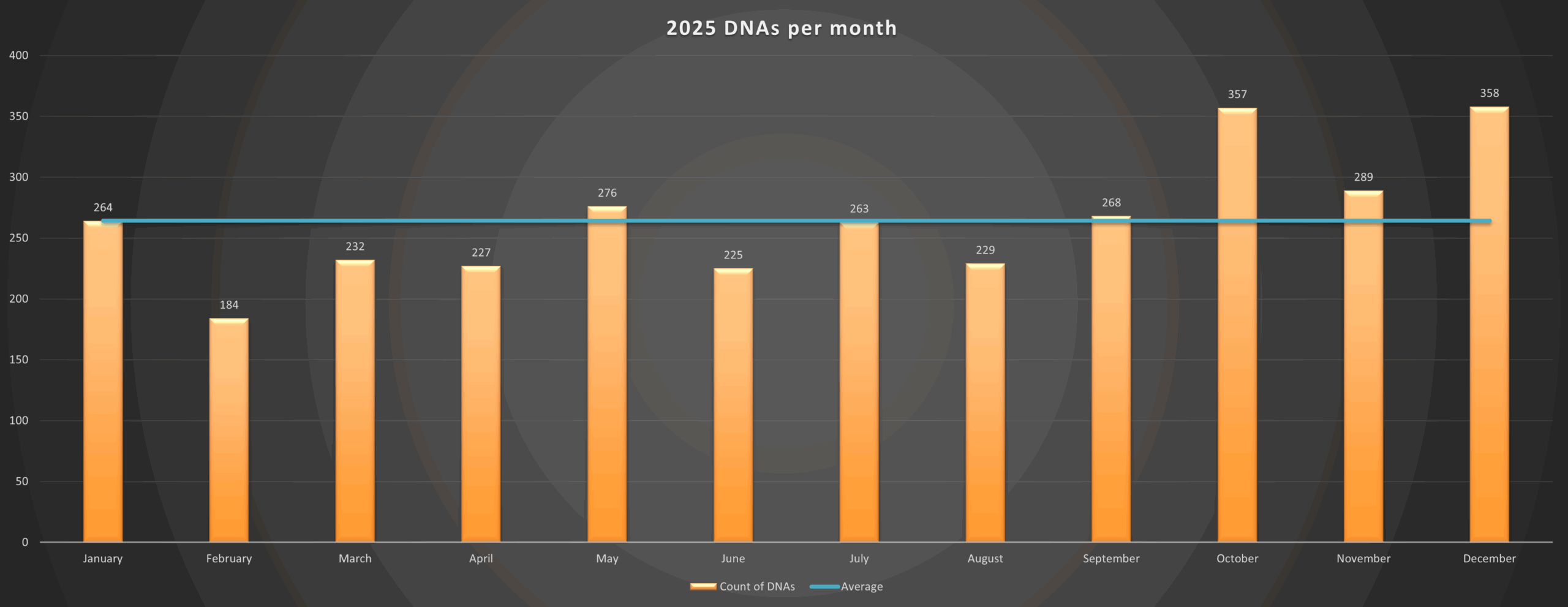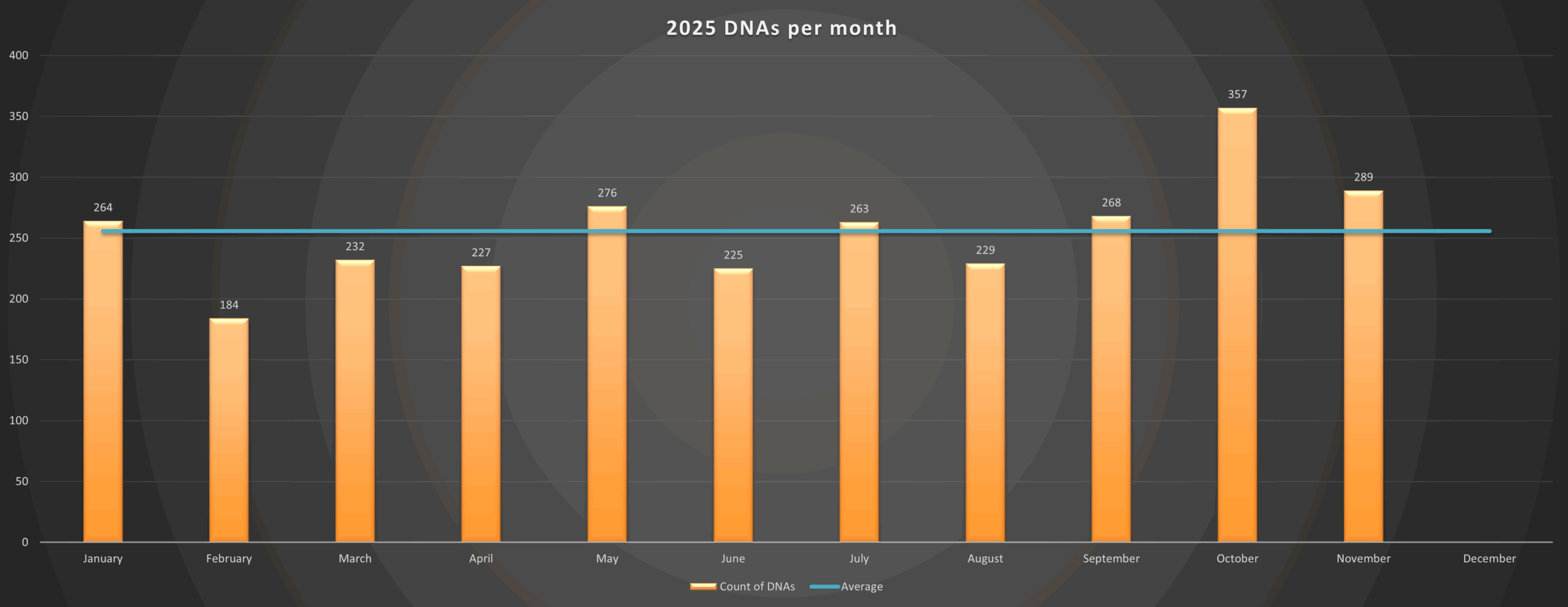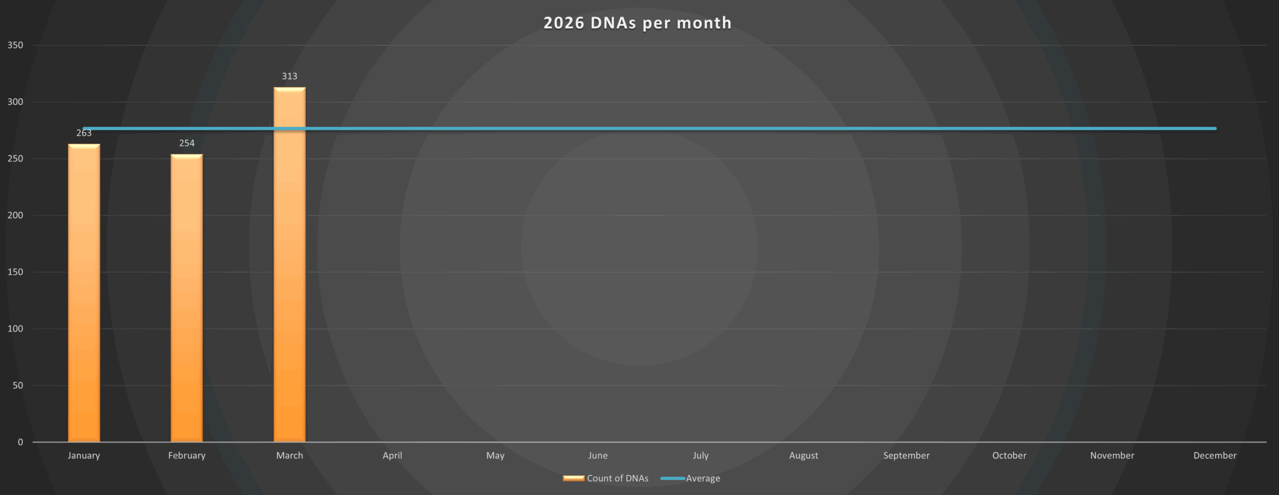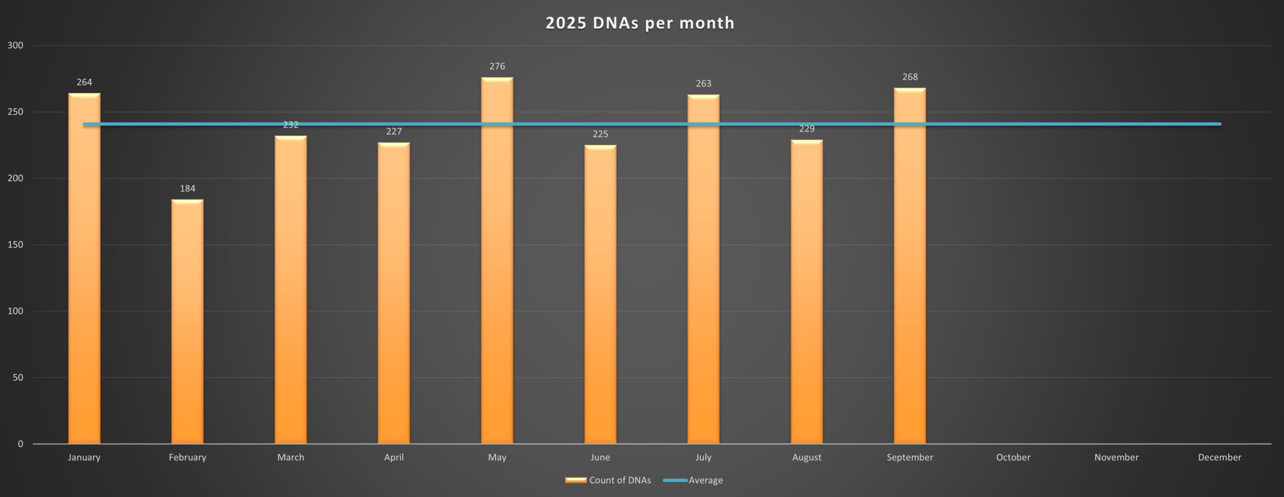 The average number of monthly appointments which fall into the ‘Did Not Attend’ category for the year is listed in the attached document. The figures are also published in our waiting area for all patients to see.